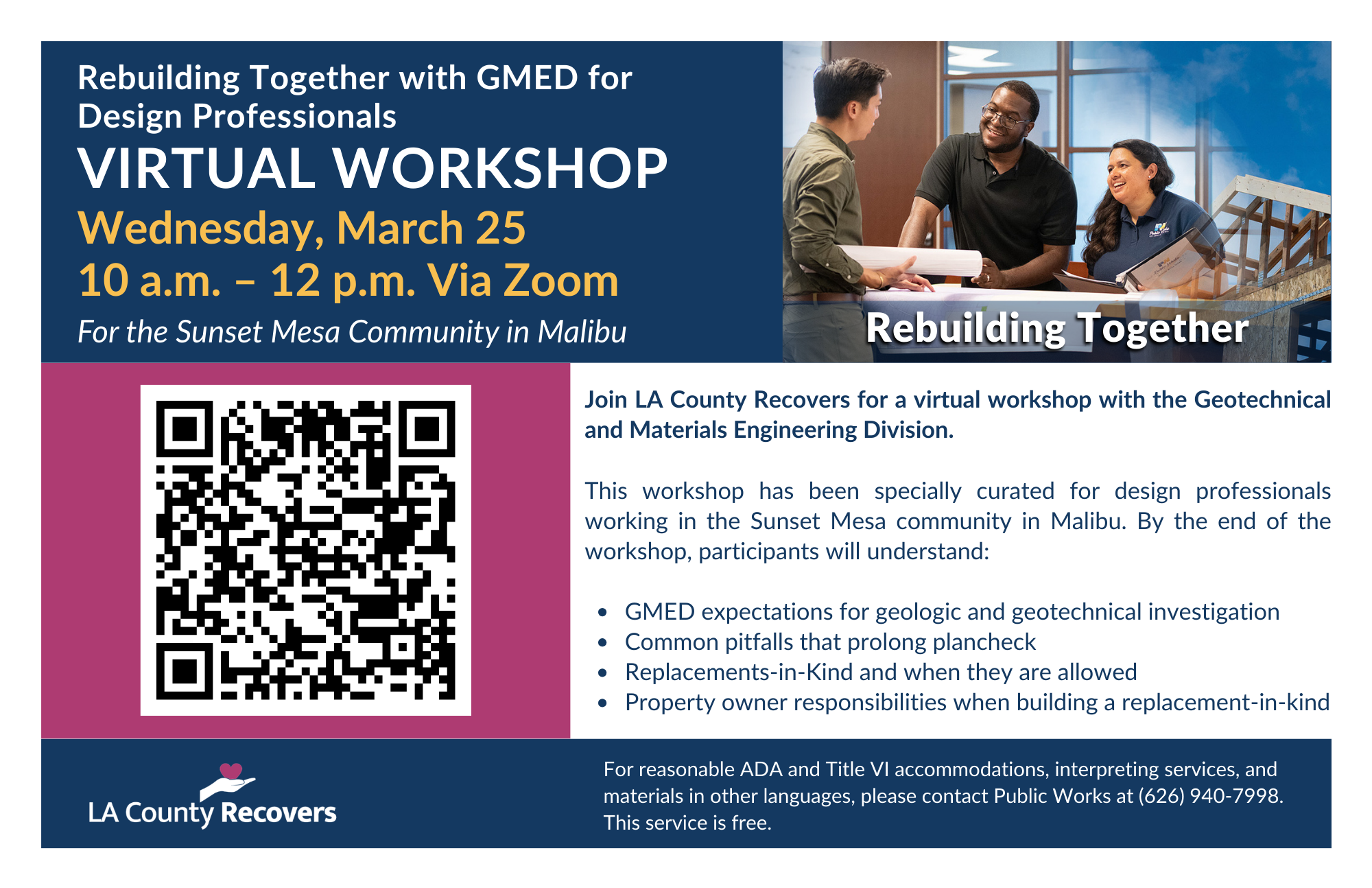 Join LA county Recovers for a virtual workshop with the Geotechnical and Materials Engineering Division. This workshop is specially curated for design professionals working in the Sunset Mesa community in Malibu.